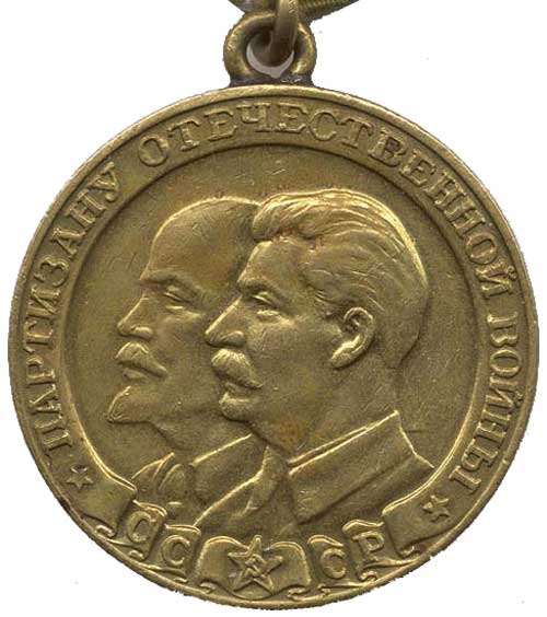 По окружности медали на ленте шириной 4 мм расположена надпись "ПАРТИЗАНУ ОТЕЧЕСТВЕННОЙ ВОЙНЫ", в начале и конце которой - две маленькие звездочки. В нижней части медали - выпуклая пятиконечная звезда с серпом и молотом в центре и с буквами "СССР" с двух сторон, расположенными на складках ленты.