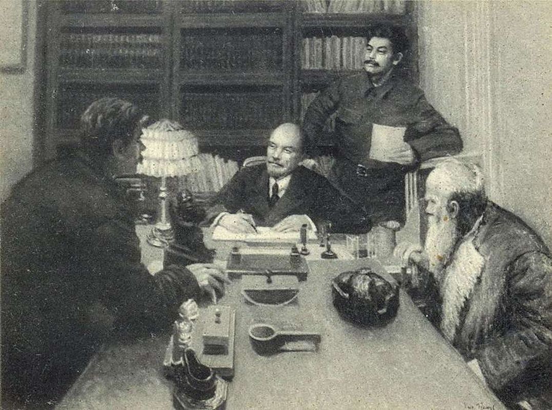 В. И. Ленин и И. В. Сталин в рабочем кабинете в Кремле беседуют с крестьянами