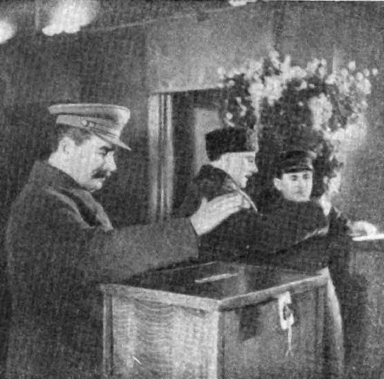 Товарищи И. В. Сталин, К. Е. Ворошилов и Н. И. Ежов голосуют в избирательном участке №58 Ленинского избирательного округа Москвы