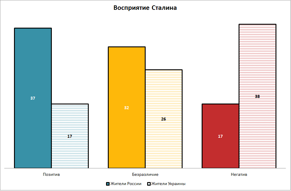 Восприятие Сталина кардинальным образом отличается среди респондентов из обеих стран. Негативный спектр эмоций преобладает в общественном мнении Украины. Доля украинцев, испытывающих к вождю такие чувства, как «восхищение», «уважение» и «симпатия», в два раза меньше числа тех, кто воспринимает его негативно («с неприязнью», «со страхом» и «отвращением»): 38% против 17% соответственно. Причем, наиболее разнятся результаты касательно выраженно-негативных оценок: если в России всего 3% опрошенных описывают свое отношение к Сталину как «отвращение, ненависть», то среди жителей Украины практически пятая часть населения — 17%.