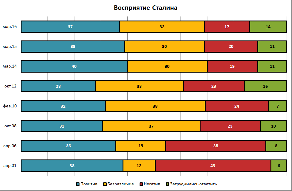 Доля россиян согласных с мнением о том, что «Сталин — мудрый руководитель, который привел СССР к могуществу и процветанию», достигла максимального значения в 57%. Треть опрошенных (33%) придерживается противоположного мнения. При этом число россиян, не считающих Сталина «великим вождем», снизилось с 37% в 1992 г. до 23% в 2016 г. за счет практически двойного увеличения доли сторонников средней позиции в шкале («в чем-то согласен, в чем-то не согласен»).