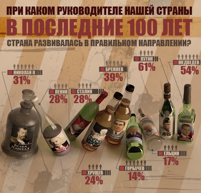 Больше всего критики звучит в адрес лидеров времен перестройки и постсоветской эпохи: так, курс М.Горбачева правильным считают только 14%, Б.Ельцина — 17%.
