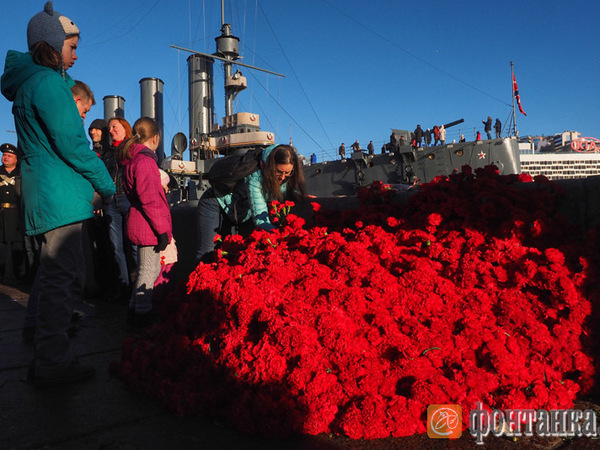 Как сообщает корреспондент «Фонтанки», к одиннадцати часам дня 7 ноября инициаторы памятной акции принесли к месту вечной стоянки крейсера 7150 гвоздик и принялись раскладывать их на набережной. Возложение отвлекло туристов от «Авроры», ведь стольких цветов не удостаивалась ни одна прима.