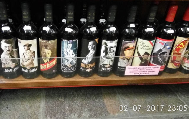 Нацистский преступник Гитлер и фашистский преступник Муссолини на бутылках вина в открытой продаже. Специальный отбор вина в магазине. Италия